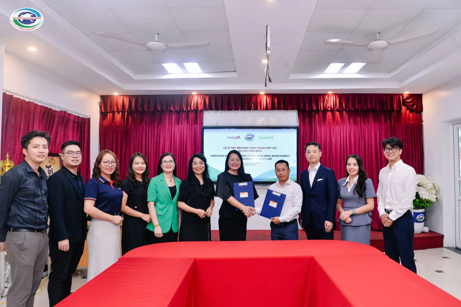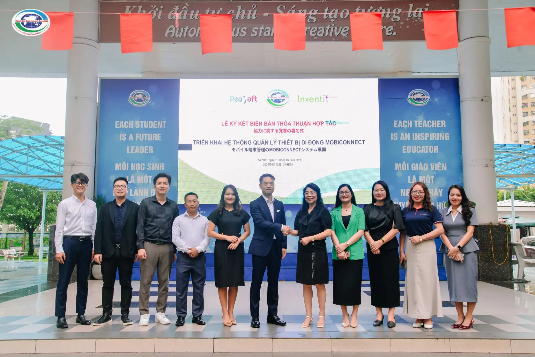 On June 12, 2025, PeaSoft Vietnam Joint Stock Company, together with Inventit Inc. (Japan) and Newton Grammar School, officially signed a Memorandum of Understanding on Cooperation to deploy Mobiconnect mobile device management solution, marking an important turning point in Newton Grammar School's comprehensive digital transformation roadmap and opening up opportunities to expand the application of technology in education in Vietnam. The signing ceremony took place solemnly at Isaac Newton Primary School - Newton Grammar School with the presence of the school's Board of Directors, senior representatives from PeaSoft Vietnam JSC. and Inventit Inc., along with a large number of teachers, students, reporters and partners in the field of educational technology.
