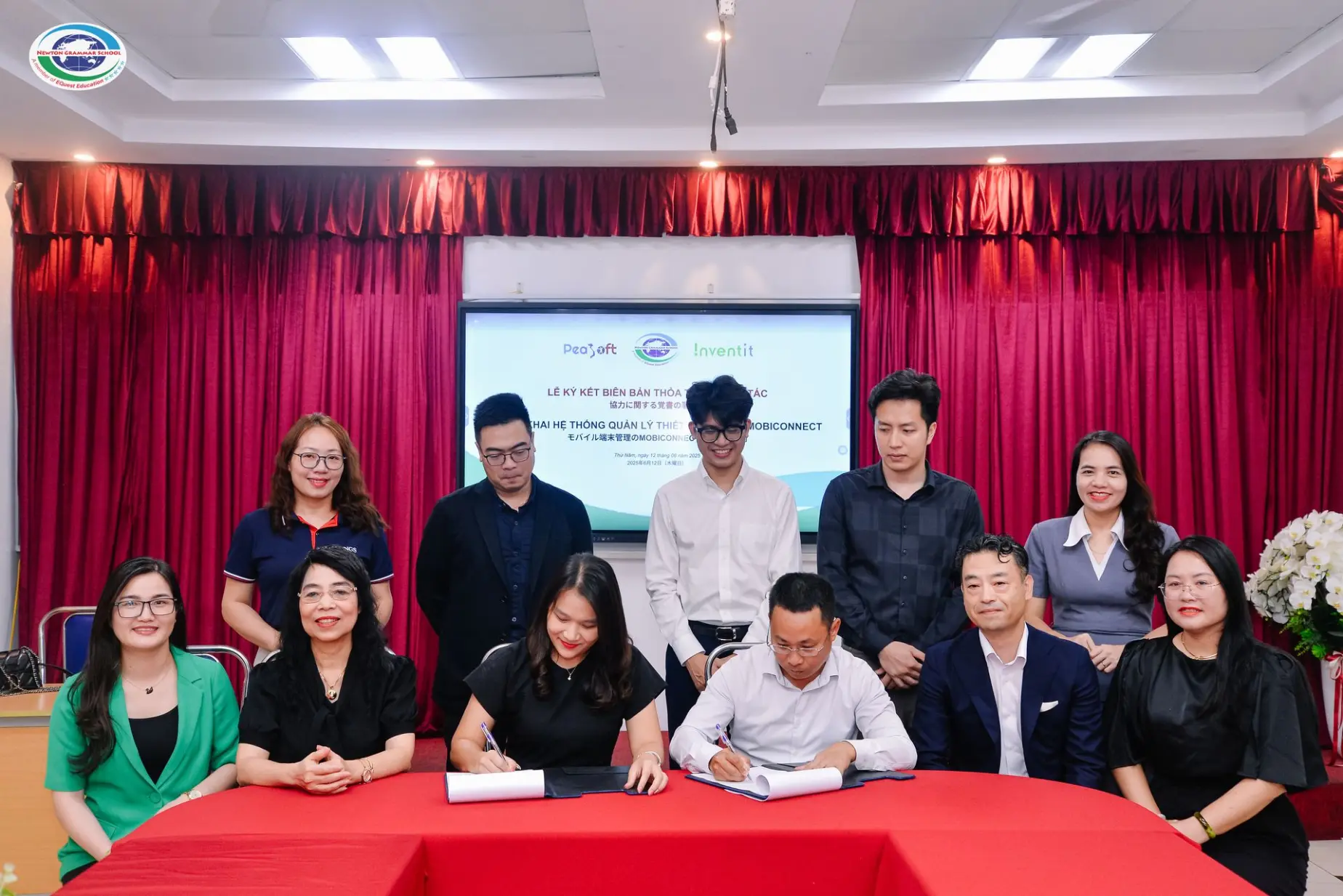 On June 12, 2025, PeaSoft Vietnam Joint Stock Company, together with Inventit Inc. (Japan) and Newton Grammar School, officially signed a Memorandum of Understanding on Cooperation to deploy Mobiconnect mobile device management solution, marking an important turning point in Newton Grammar School's comprehensive digital transformation roadmap and opening up opportunities to expand the application of technology in education in Vietnam. The signing ceremony took place solemnly at Isaac Newton Primary School - Newton Grammar School with the presence of the school's Board of Directors, senior representatives from PeaSoft Vietnam JSC. and Inventit Inc., along with a large number of teachers, students, reporters and partners in the field of educational technology.